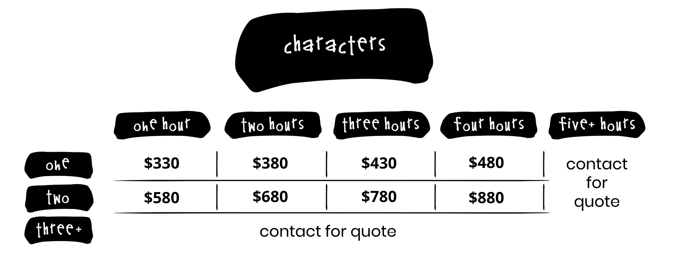 Price estimates include set-up, breakdown, puppet/ character rental, puppeteers, and a handler.